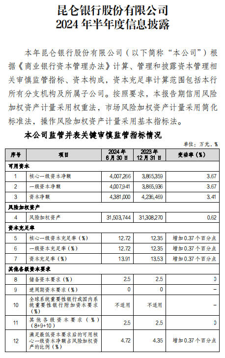 昆侖銀行股份有限公司2024年半年度信息披露 |