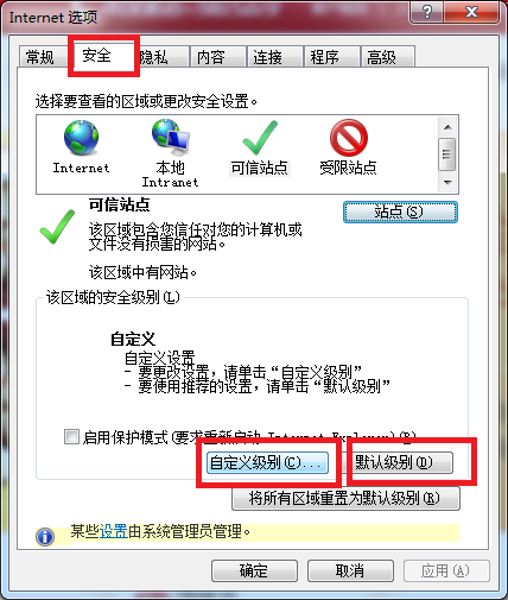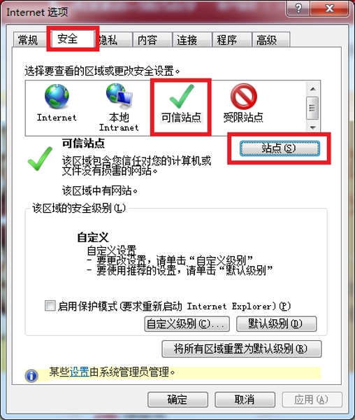 2.請您點擊“安全”-“受信任的站點”-“站點”。