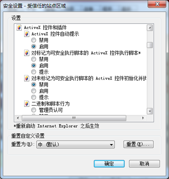 2.請您在新彈出的窗口中,將其中的“對標記為可安全執行腳本的ActiveX控件執行腳本”、“下載已簽名的ActiveX控件”、“運行ActiveX控件和插件”分別設為“啟用”,然后點擊“確定”。
