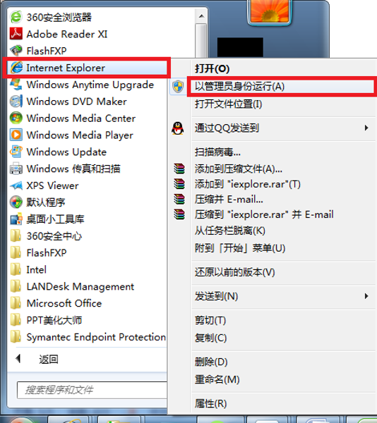 步驟四:使用管理員身份打開瀏覽器。 請您點擊“開始菜單”-“所有程序”,將鼠標停放在Internet Explorer圖標上,點擊右鍵選擇“以管理員身份運行”。