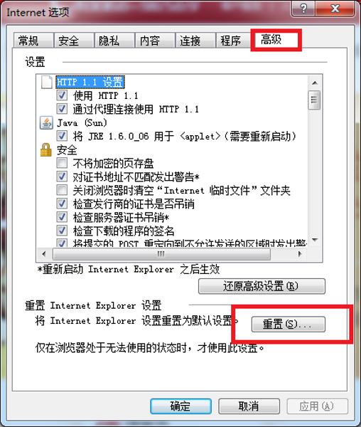 步驟五:若仍出現此問題,請您打開IE瀏覽器,點擊“工具”-“Internet選項”-“高級”-“還原默認設置”或“重置”后確定退出。