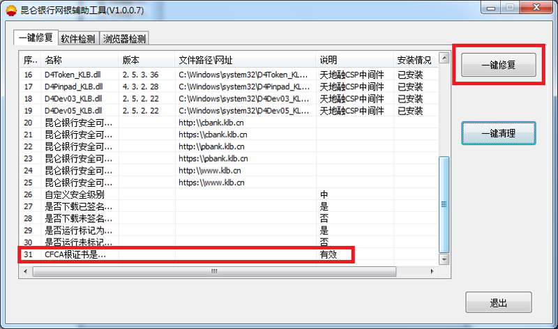 5.若第31項顯示無效,請您點擊“瀏覽器檢測”-“安裝CFCA根證書”,若仍安裝不上,請您在安裝證書期間嘗試退出殺毒軟件。